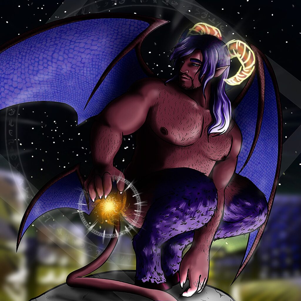 Ele começou com visual de demônio popular: chifres, asas e cauda por causa das minhas cicatrizes cristãs. Depois ganhou pernas de bode e chifres curvados, inspirado nos sátiros, porque arte e caos fazem parte de mim. A essência dele veio dos Jinn, seres ligados à criatividade e à capacidade de criar — igual a gente quando resolve fazer arte às três da manhã.