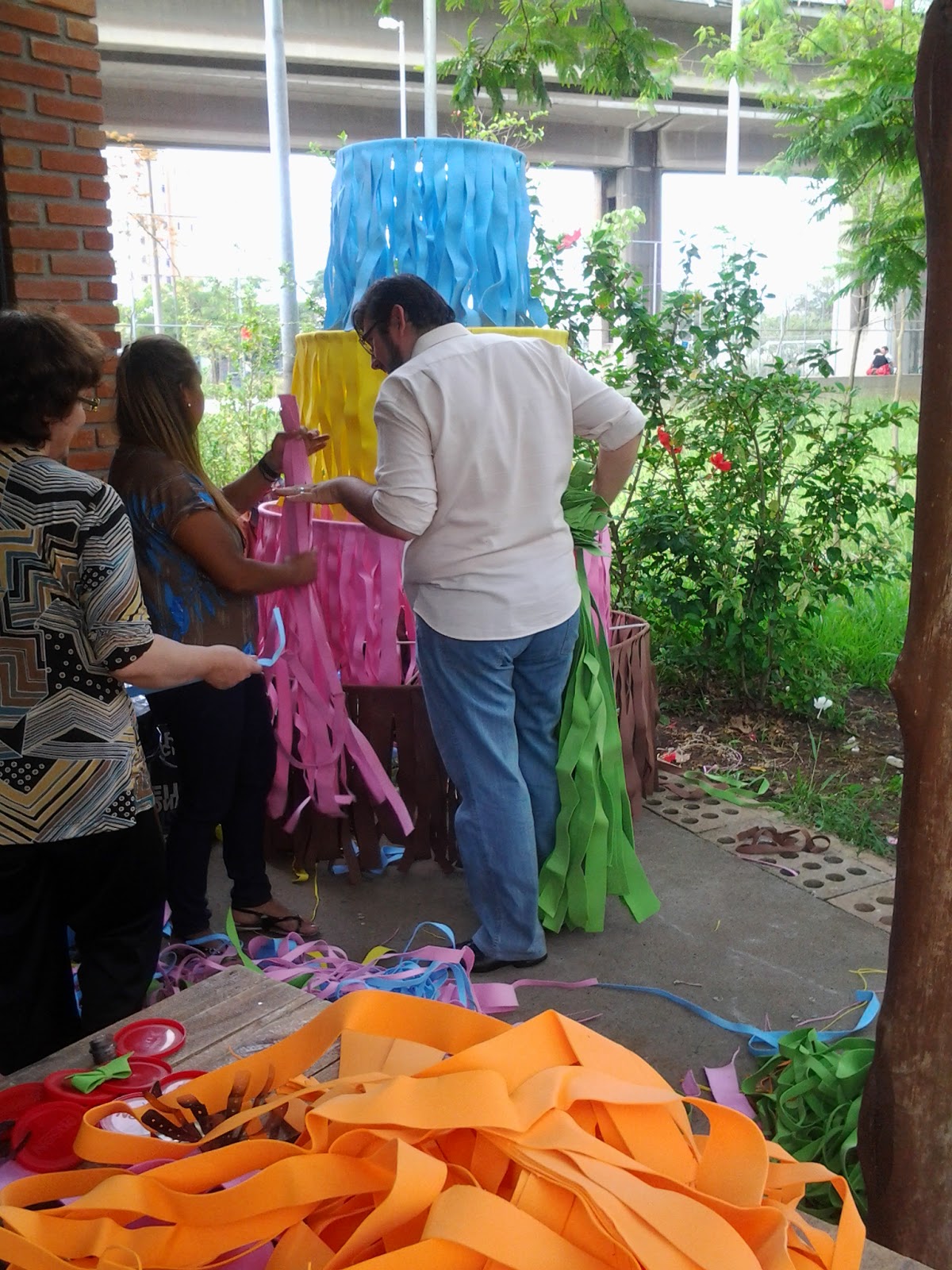 Assim para decorar a arvore surgiu o pequeno inconveniente de não haver recursos para comprar decoração natalina tradicional, então mais uma vez tivemos que apelar para a criatividade e trabalho em equipe e funcionários do parque e colaboradores foram pedir nas empresas ao redor retalhos para a realização da árvore, como ninguém nos deu nada (o que em nada me surpreendeu) pegamos no lixo industrial sacos e sacos de retalhos de EVA cujo único destino seria “sujar” o nosso meio ambiente. Marcamos um dia para montar a árvore como apresentamos: